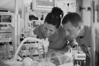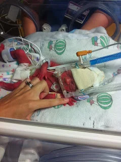 I was not allowed to see my babies right away. Justin followed a team of 10 doctors and nurses into the NICU. After I was stable I was wheeled back into my hospital room without my babies in my womb...or my arms. This was an extremely hard time for me. I was still numb from the chest down, I had no idea if my children were ok, and I didn’t have Justin by my side. Praise God after an hour I was wheeled in to meet my precious daughters for the first time! I was still numb and on a stretcher. My little girls were inside their new “womb” in the incubators. They each had a dozen cords attached to their tiny bodies, hooked up to 3 separate monitors, and a CPAP machine in place to help remind our little babies to breath. I was allowed to reach my hand inside the small opening of the incubator to hold their tiny hands for a couple of minutes. I was later able to hold my girls skin to skin, (which they refer to as “Kangarooing”). I looked forward to my kangaroo time each and every day I woke up. I will forever cherish that time that I had with them.